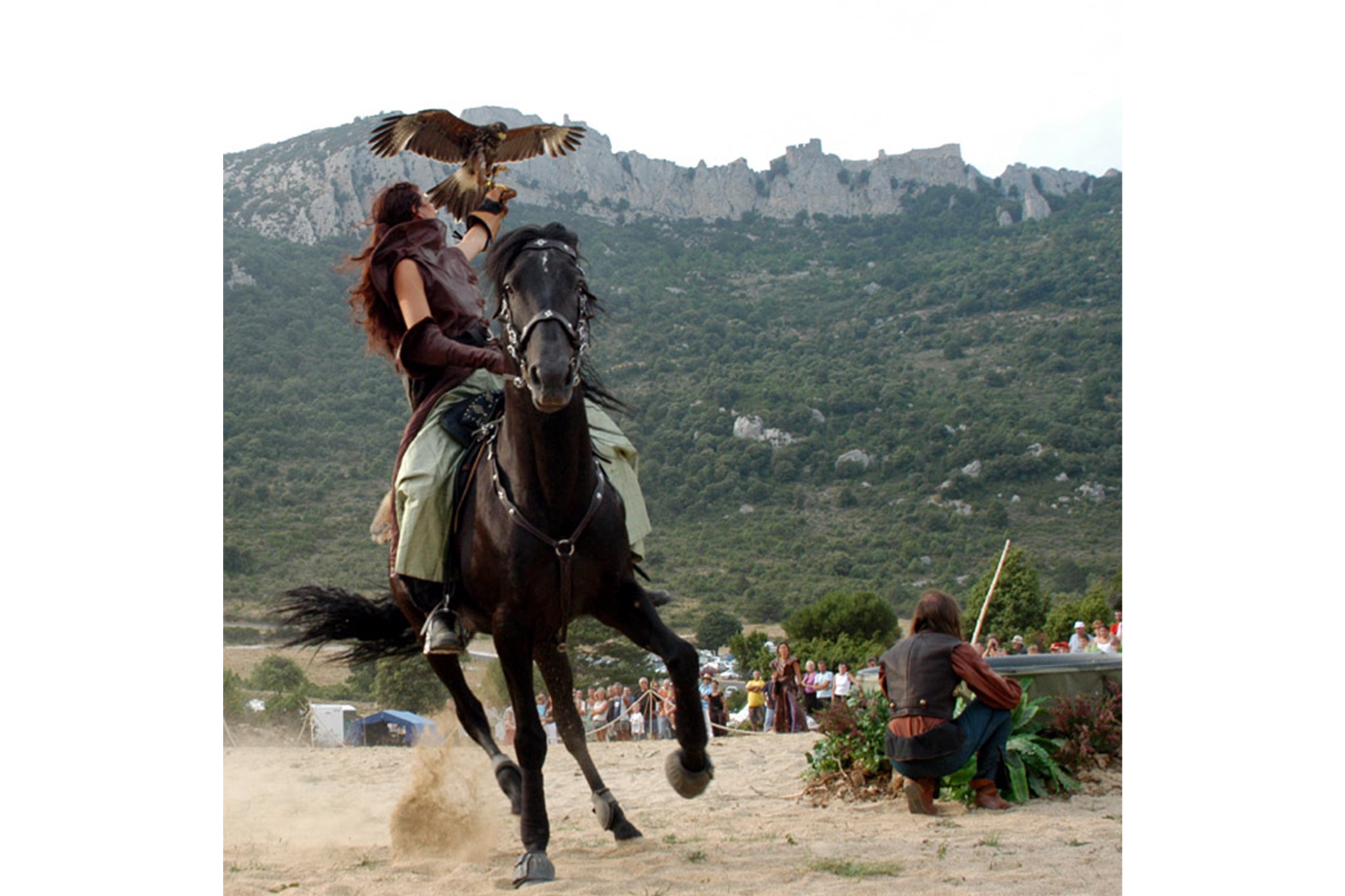 Nous proposons également des démonstrations de fauconnerie à cheval, une pratique commune avant la révolution avec ce qu'on appelait les chevaux de roi : Espagnols ou Portugais. Pour notre part, nous avons choisi le pur-sang lusitanien. Tous nos chevaux proviennent de la famille Arnal (Domaine de Gaillac) : www.lusitanien-arnal.com